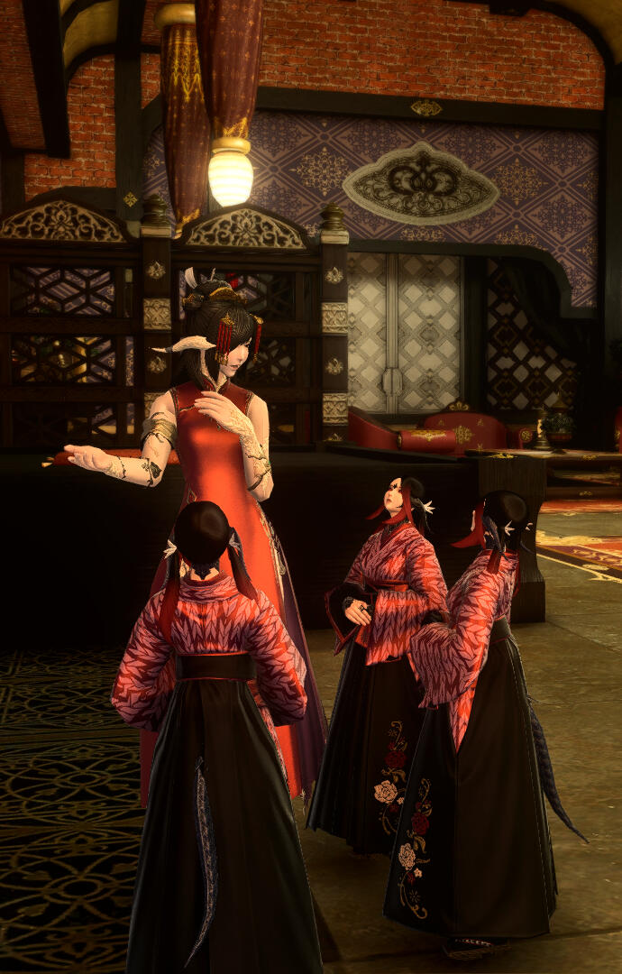It all sounds very convenient, doesn't it? That I am a benefactor the circumstances of my birth, that I was selected out of my three sisters to receive Kaede's expert tutelage in the dark underbelly of Eorzea and Othard, and to feed off of illicit riches.I recognize my sins against the world. Chief among them robbing women and men of their freedom strictly for the pleasures of malcontents. Yet I still would not have it any other way; I understand the human condition far better than I have any right to.So what are my own pains and struggles compared to those I victimize? Do I deserve to have my voice heard? No. But like so many other things I don't "deserve", I am going to voice them anyway.I still dealt with the consequences of having xaela scales in a city occupied by hyur, roegadyn, and raen au ra. Did I deserve that? No. But I accepted my mother's mentorship anyway, and rose to power despite these misgivings. I will never consider myself a victim. Easy to say from the top, isn't it? Well, the top was not given to me, despite what you might have been told.I earned it.