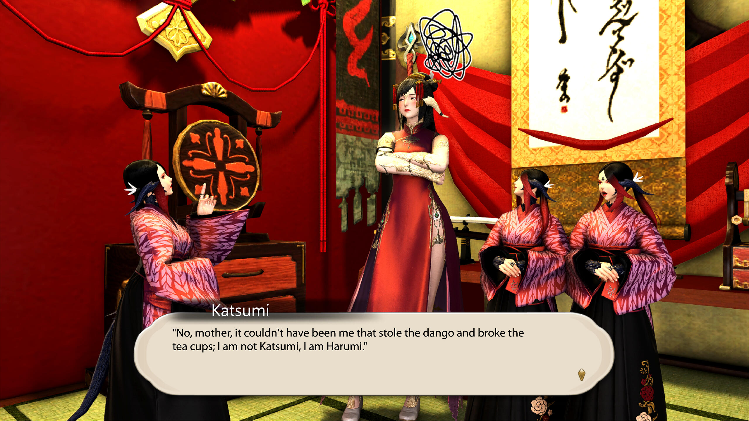 But it did not end there. Once the sixth moon had passed since that dreadful day, Harumi was called away to Kugane. There, she learned the death of my mother was a ruse by the living breath of Kaede herself. That the Orochi spirit we held in the Mercantile was not being fed properly, and it would soon lash out and kill us if Harumi did not intervene. To replace me as Merchant Princess. Two moons later, I approached Kaede myself and learned the horrid truth: There was once a fourth daughter. We were, in fact, quadruplets. Kaede had sacrificed my third sister before the beginnings of our memories as toddlers.